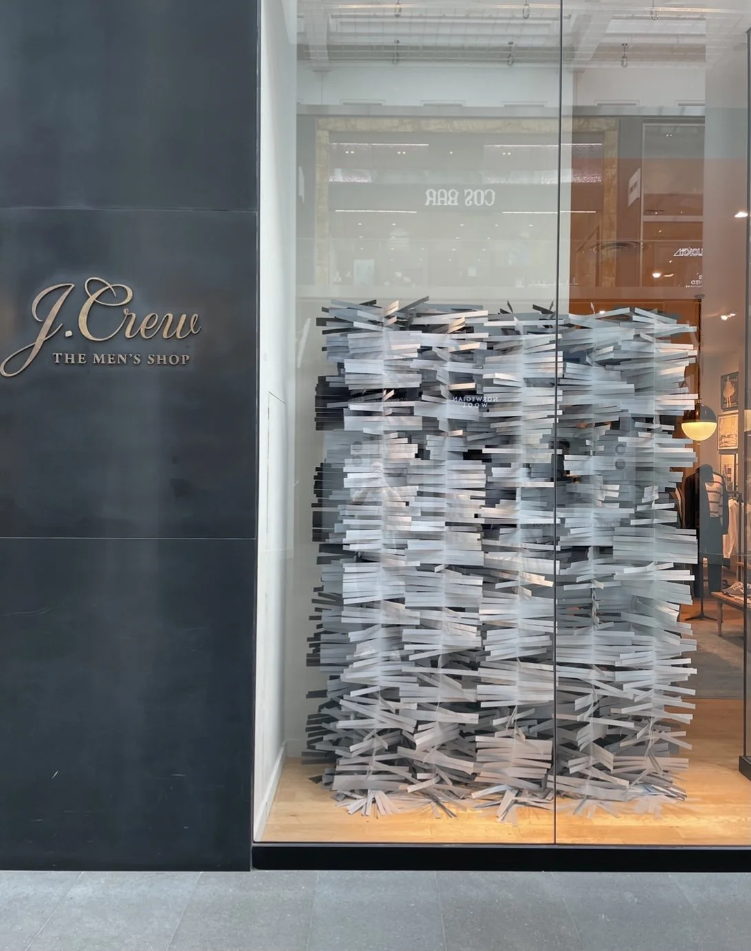 Fall Colors J.Crew This project was inspired by the colors of the fall collection and the turning of autumn leaves. Recyclable sheets were chaotically trimmed and woven into a monofilament spine. The final design made use of two eco-friendly paper layering systems which served as backdrops for the Fall collection.