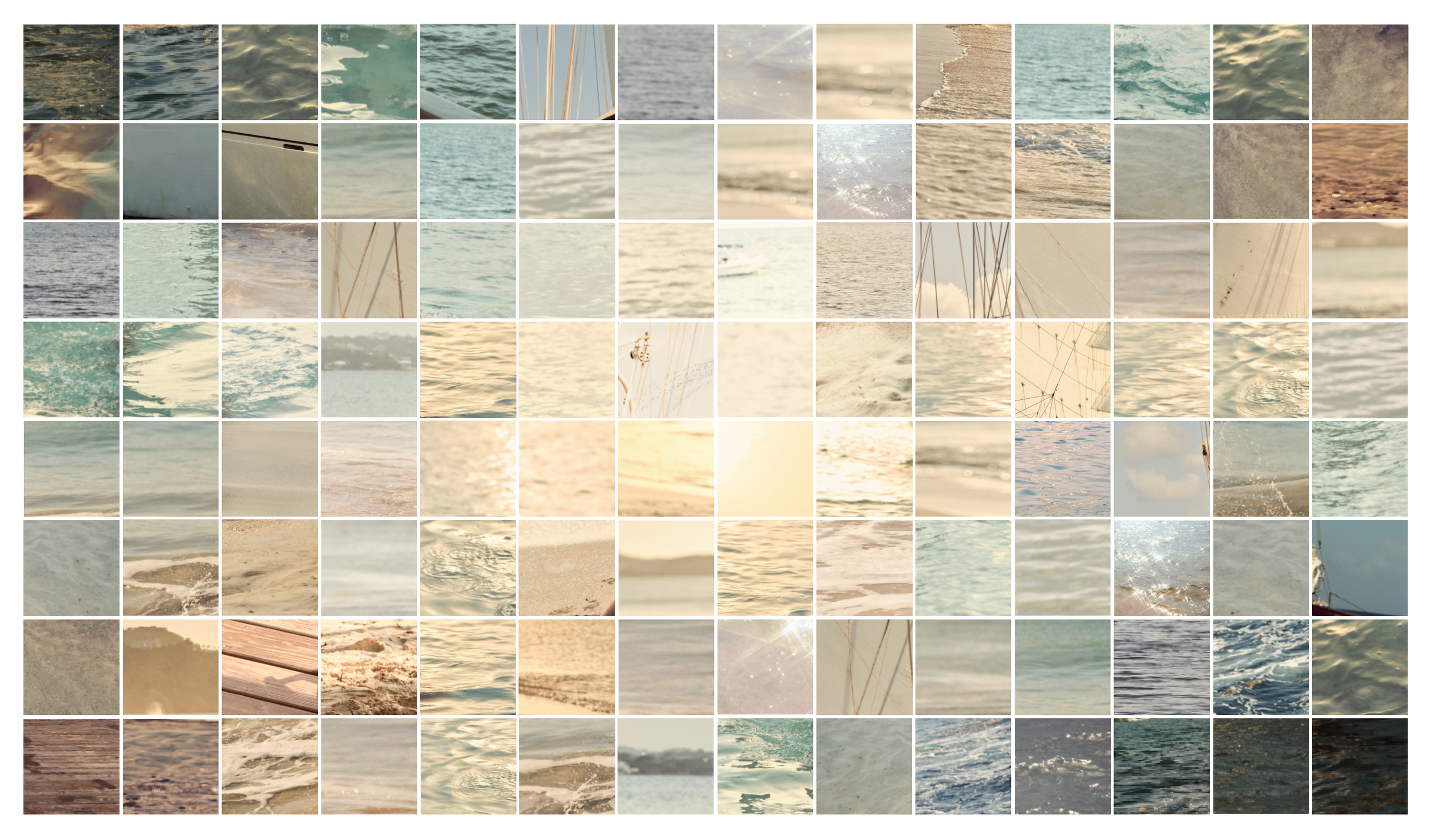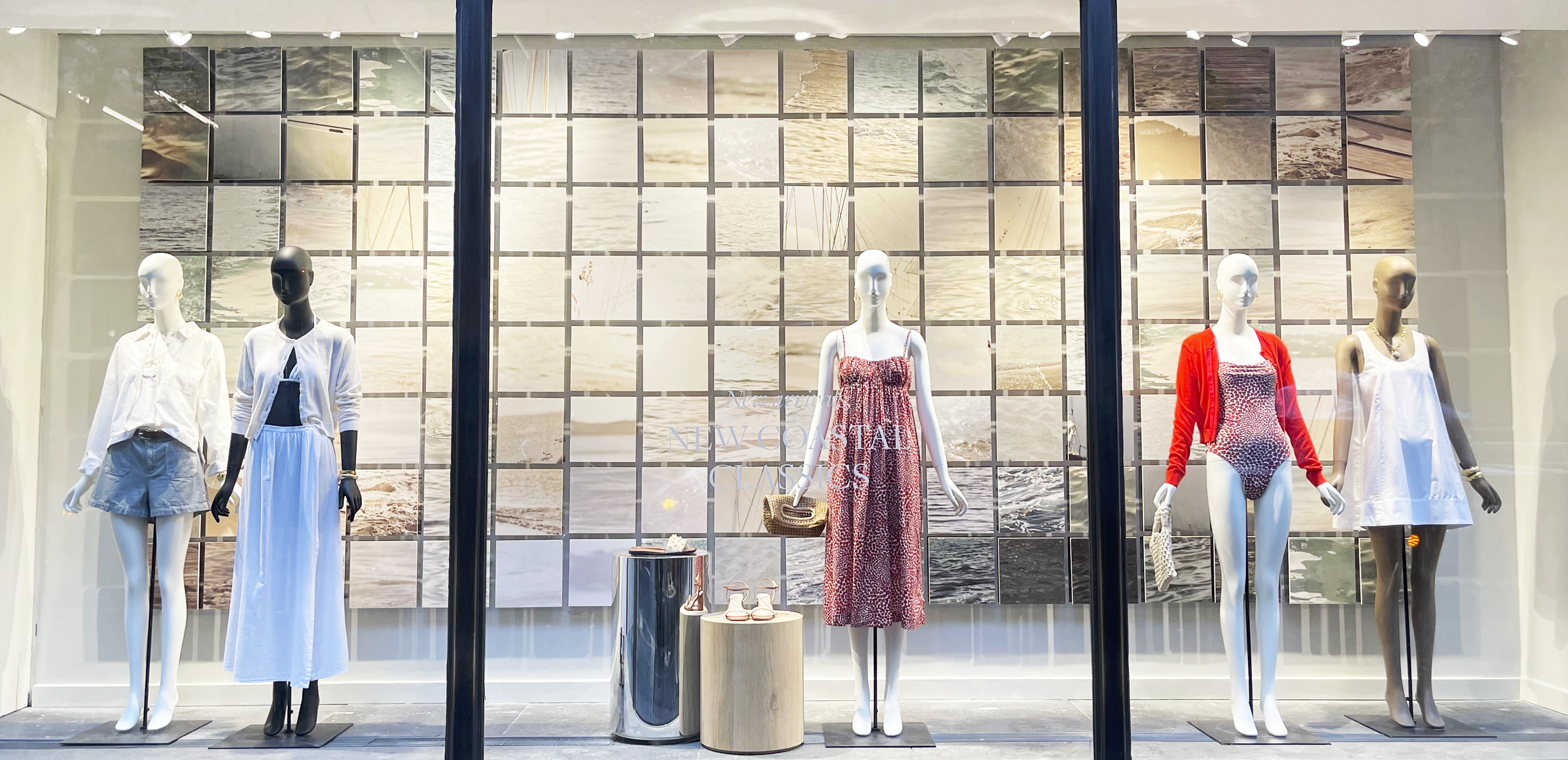 New Coastal ClassicsJ.Crew This collage was inspired by and created making use of the beach backgrounds of the summer photography locations. The photos were arranged to recreate the transition when the sand becomes the ocean. The result was a clean and contemporary collage of floating tiles to match the summer styling point of view.
